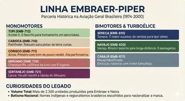 A Parceria Piper: Para suprir o mercado doméstico de aviação leve, a Embraer firmou um acordo com a americana Piper para montar aeronaves como o Seneca e o Corisco sob licença, impedindo que divisas saíssem do país e mantendo as linhas de montagem ocupadas.