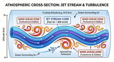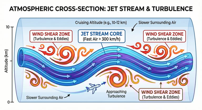 When the fast air of this "river" interacts with the slower air surrounding it, friction is created at the boundaries, generating chaotic eddies of air. It is exactly like the current of a real river creating turbulence along its banks. If an aircraft crosses this boundary, it enters the turbulence zone.