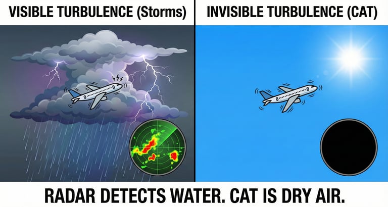 Unlike convective turbulence, which occurs inside Cumulonimbus clouds (thunderstorms) and is visible to both the naked eye and radar, CAT is stealthy. It happens in clear air, devoid of visual clues.