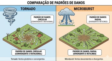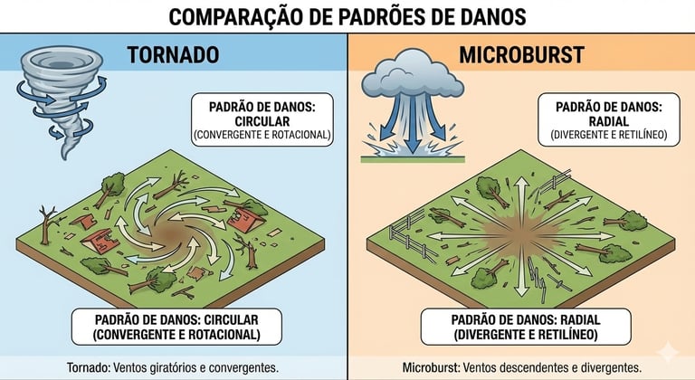 E fundamental destacar que, enquanto o tornado é caracterizado por um funil rotativo que suga objetos para o centro, o microburst “explode” o ar para fora, empurrando tudo em direção radial. Por isso, os padrões de destruição são diferentes: no tornado, os destroços convergem; no microburst, divergem.
